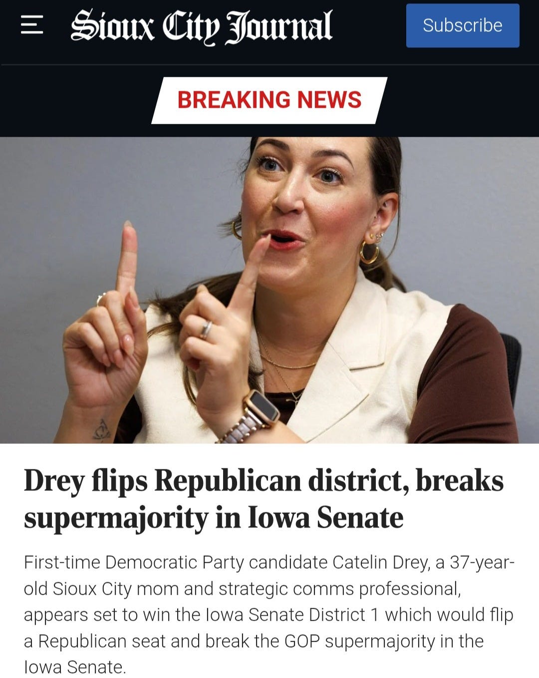 In last night’s special election, Iowa Democrats flipped a state Senate seat and BROKE the Republican supermajority in their state legislature!