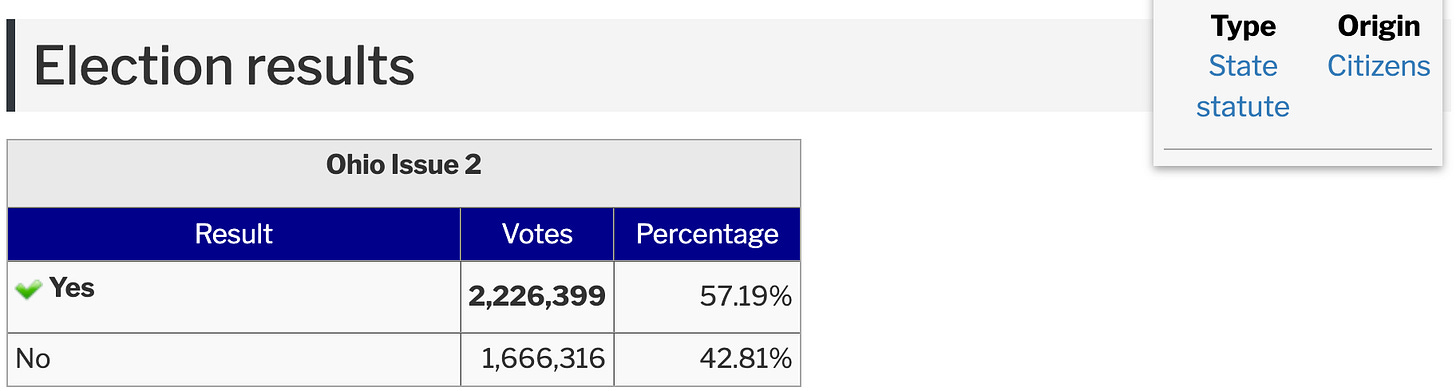 In November 2023, Ohio voters overwhelmingly approved Issue 2 with over 57% of the vote. That’s a huge percentage in a state like ours.