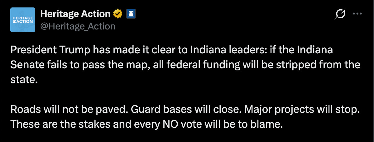 Several Republican legislators received “swatting” threats or death threats. And today the Heritage Foundation echoed President Trump’s threats to defund the entire state if Republicans failed to further rig their maps.