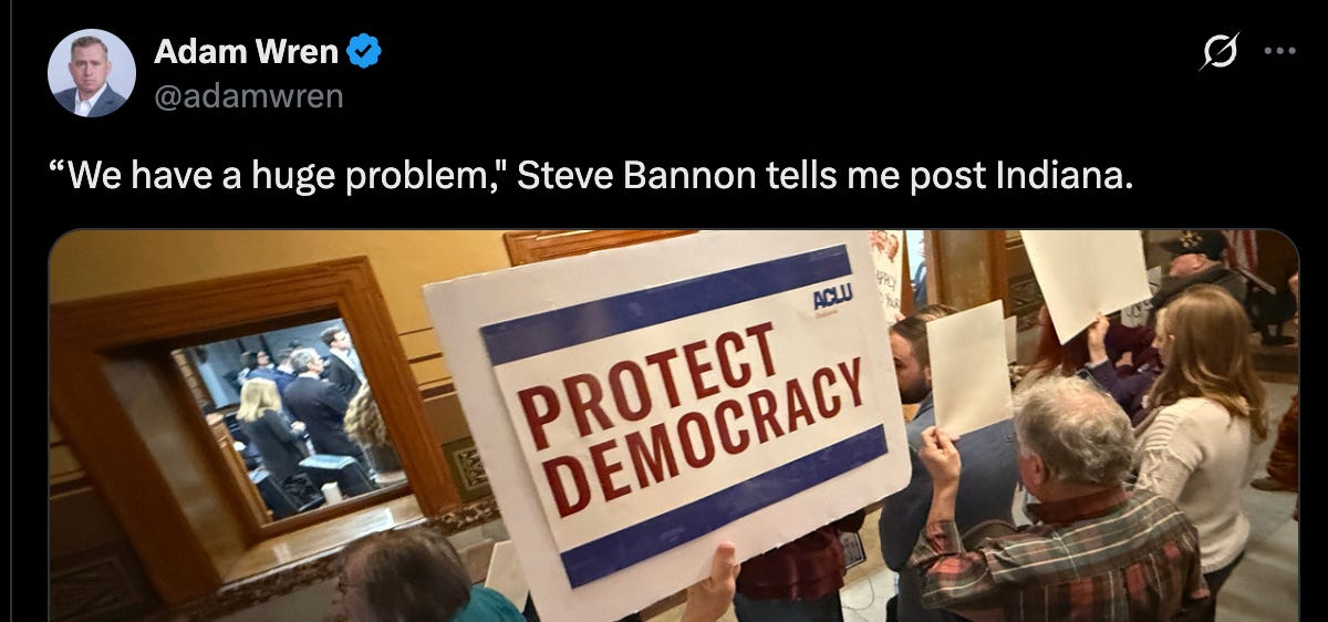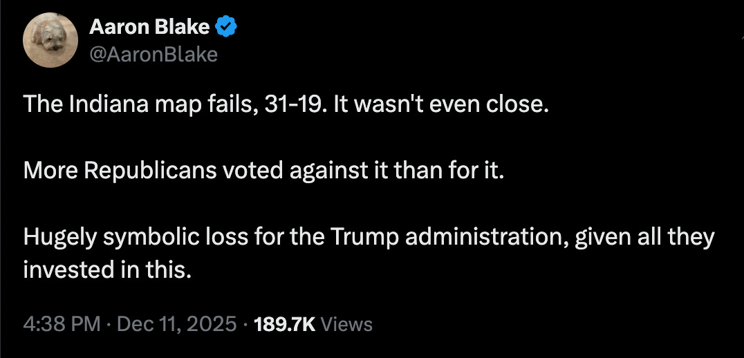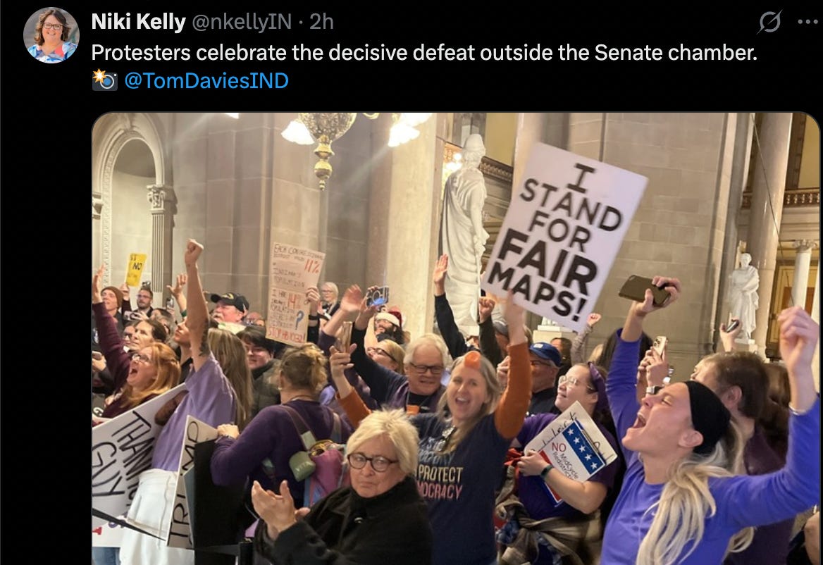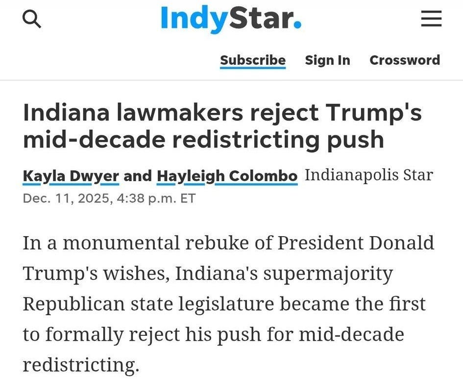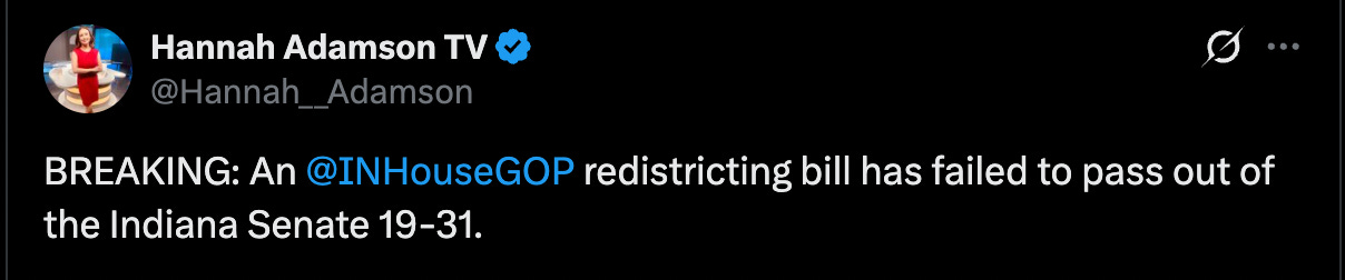 The Indiana Republican supermajority has REJECTED Trump’s demand that they rig the state’s congressional district maps to remove ALL Democratic seats.