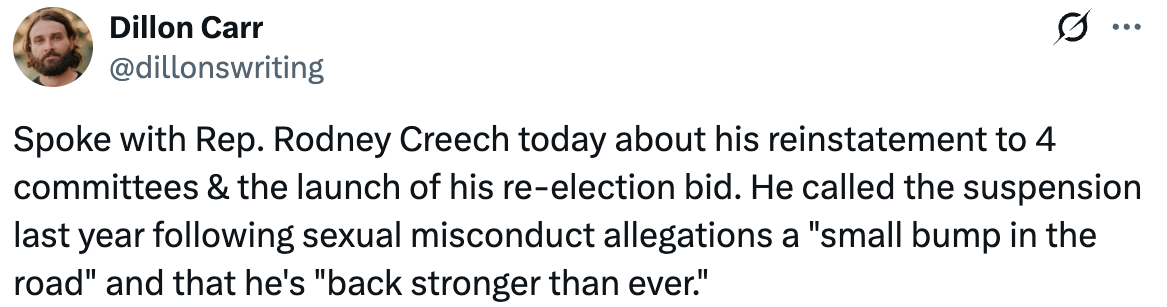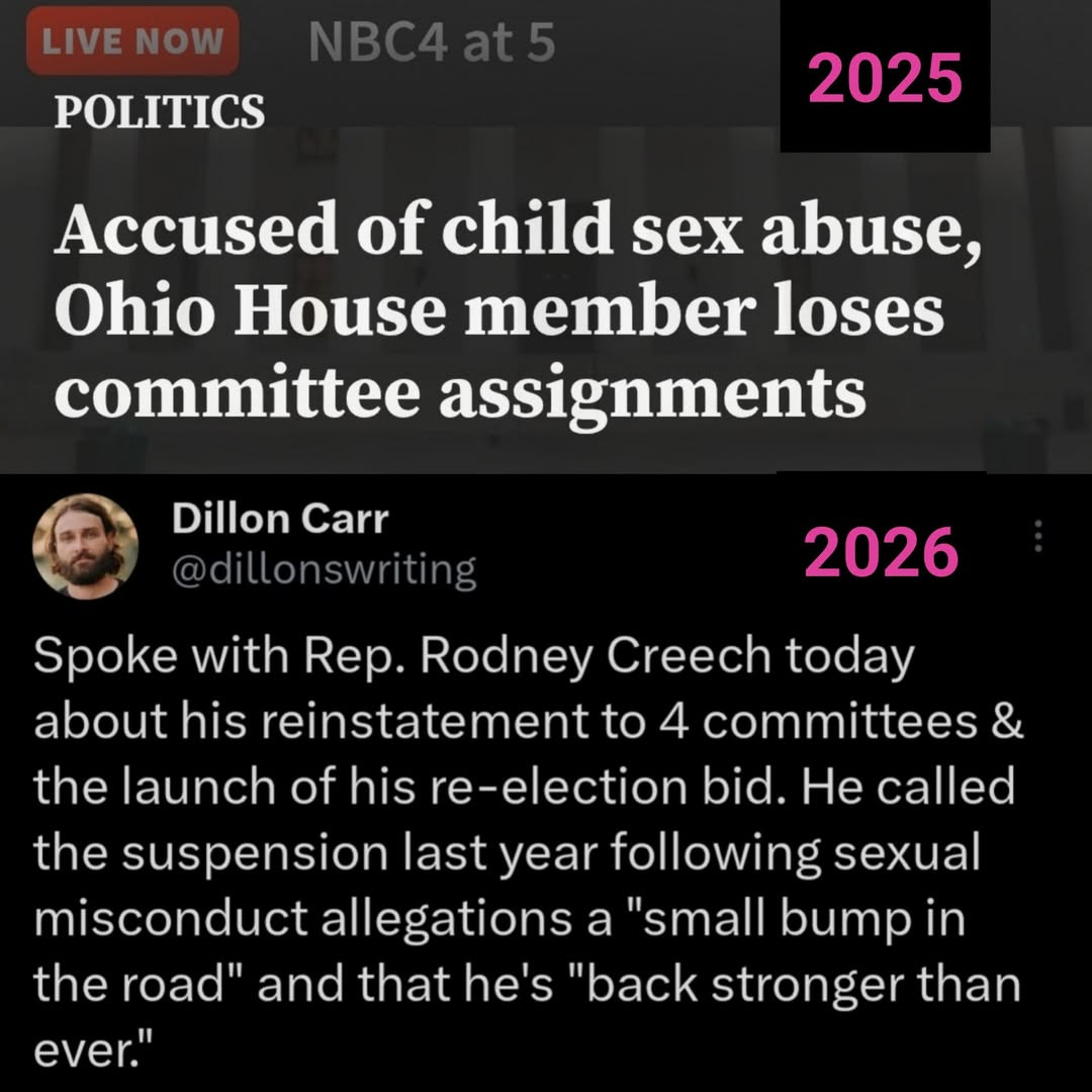 Last year, Rep Creech was removed from his Ohio Statehouse committees after credible allegations of child sexual abuse emerged.