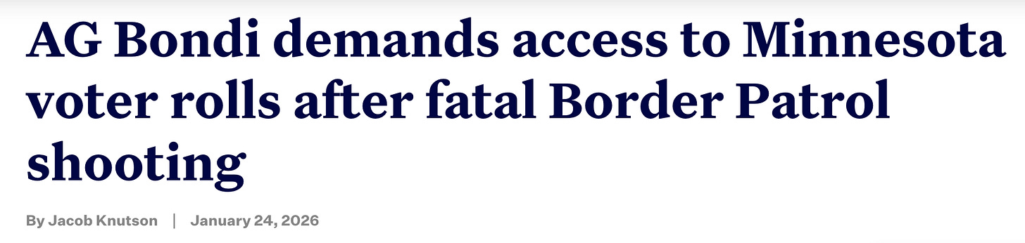 Yes, really. A few hours after ICE murdered Alex Pretti, Pam Bondi sent a letter demanding the state hand over its full, unredacted voter file in exchange for ICE leaving Minneapolis.